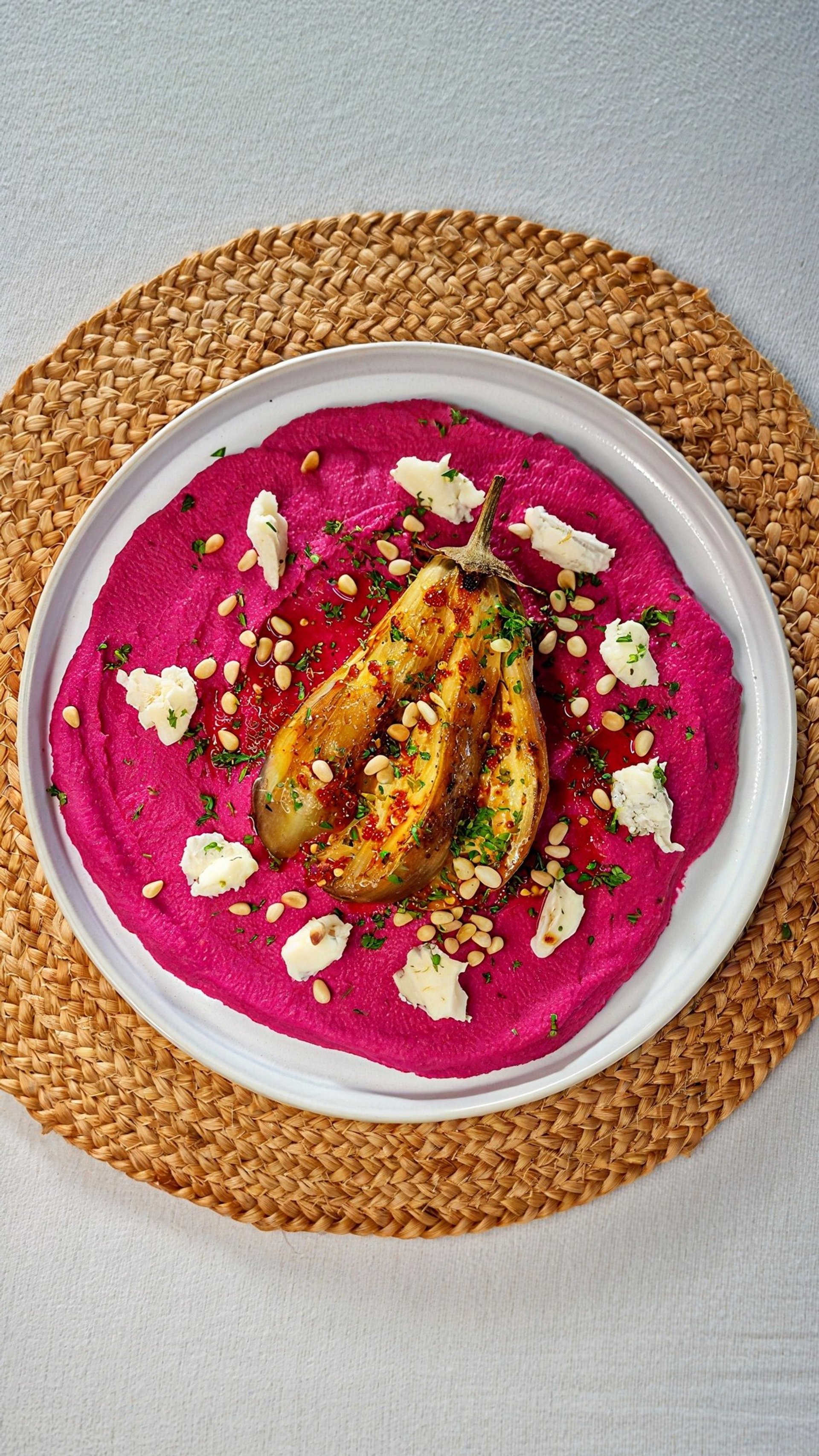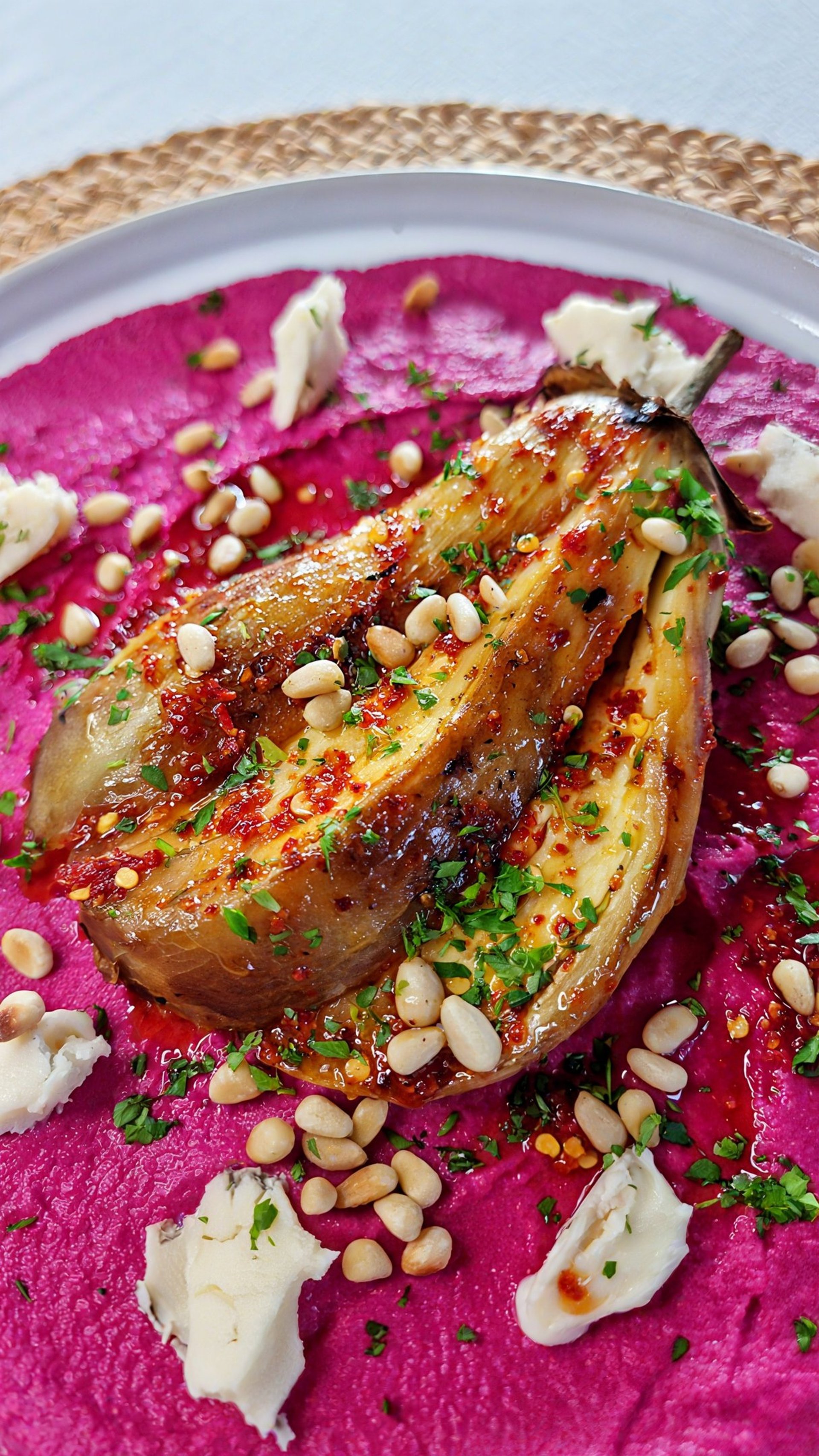 Eine Schicht Rote-Bete-Hummus auf einem Teller oder einer Platte verstreichen. Die warmen Auberginen darauflegen und mit etwas vom Dressing beträufeln. Mit Gorgonzola-Stückchen, gerösteten Pinienkernen und frischer Petersilie bestreuen. Mit Fladenbrot servieren – perfekt zum Dippen! 🫓