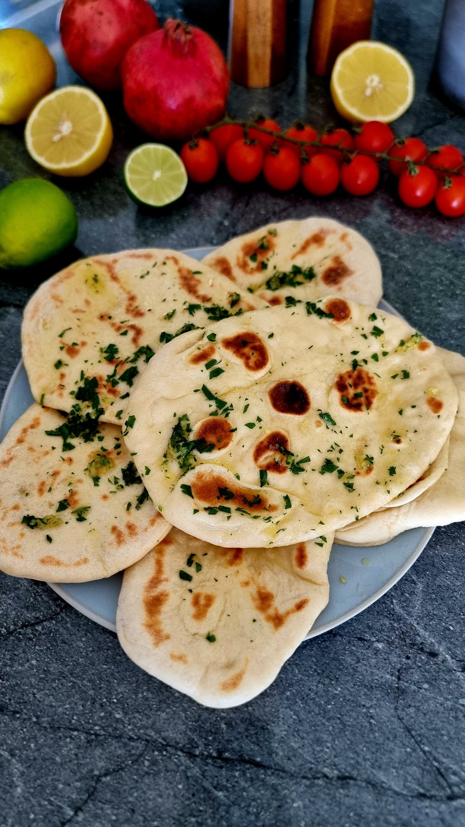 Knoblauch-Naan: 1–2 Knoblauchzehen fein reiben und mit 2 EL Butter + Petersilie mischen; nach dem Backen aufstreichen.