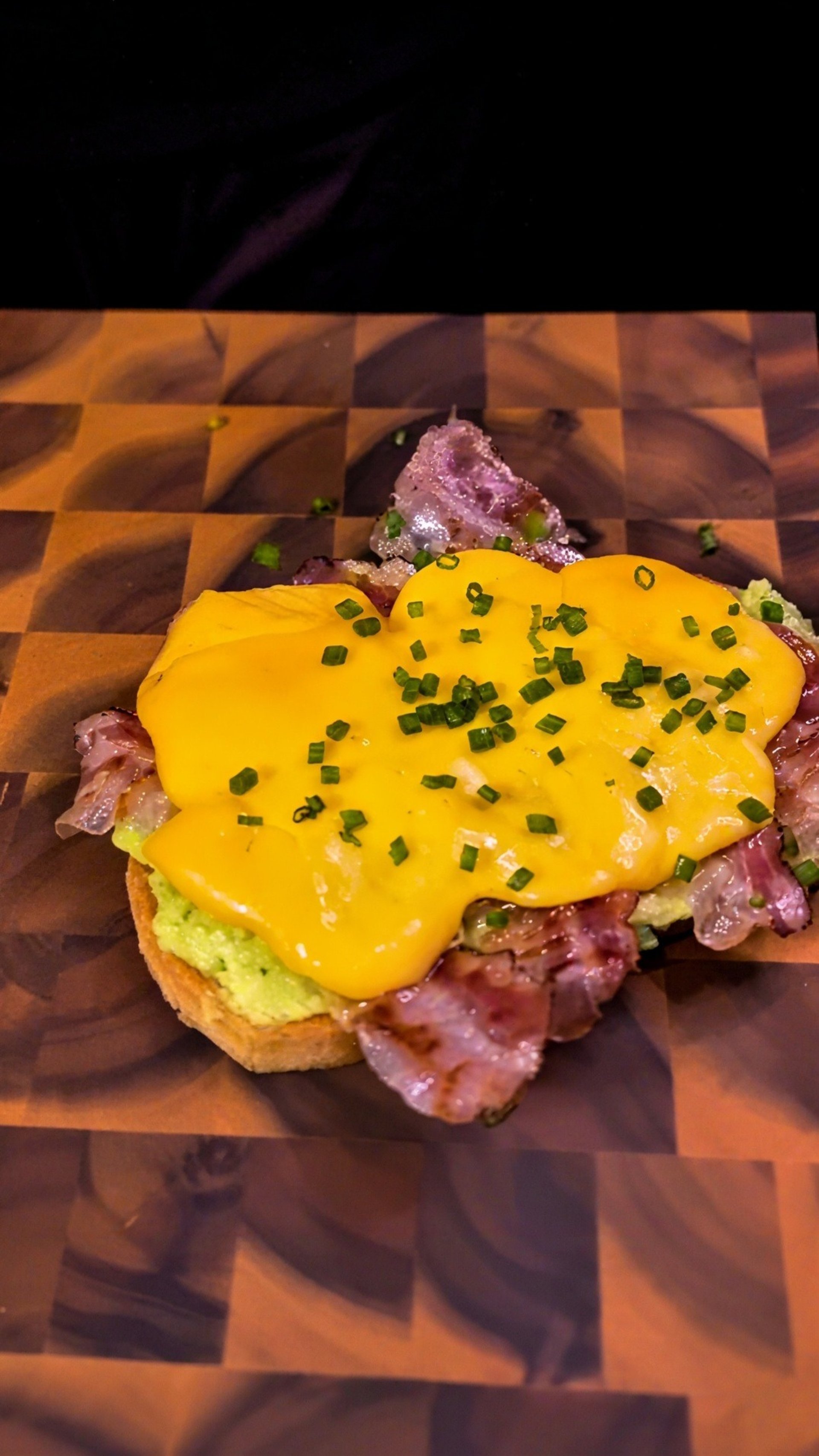 Spread the mashed avocado onto one slice of toasted bread. Add the crispy bacon. Top with the layer of melted cheddar.